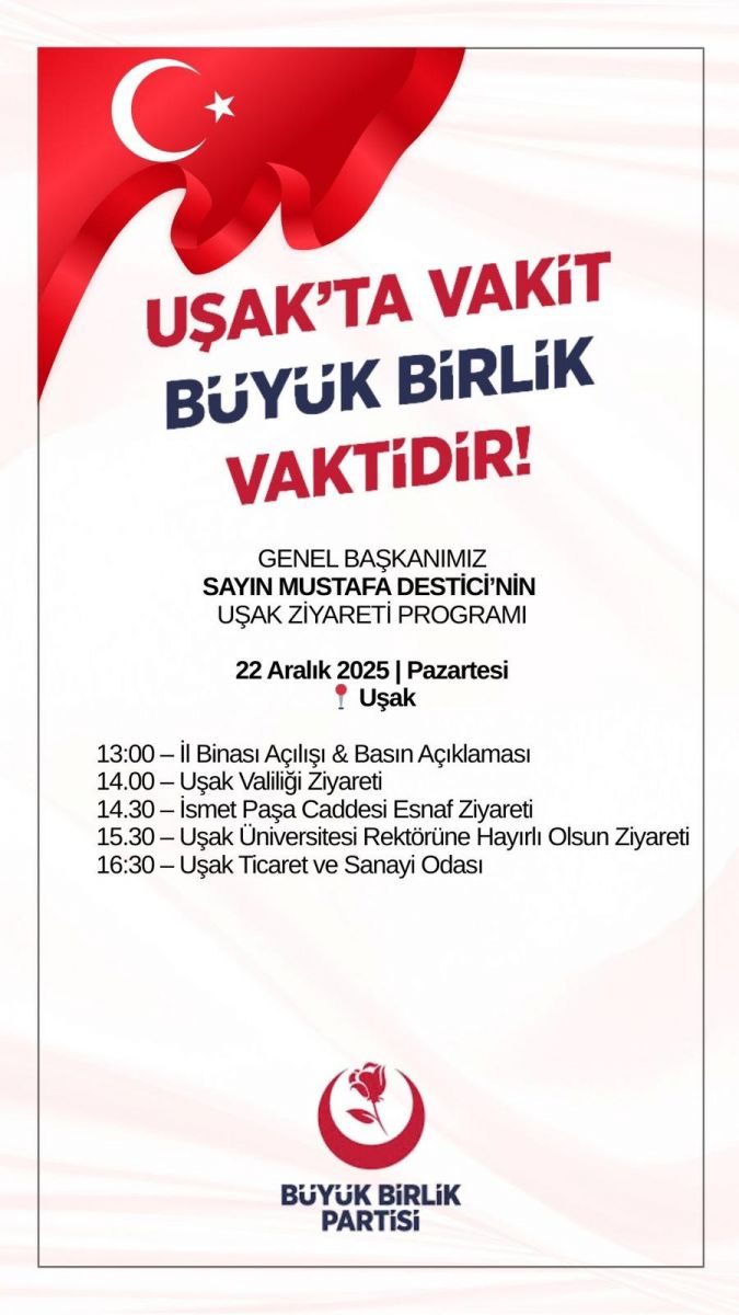 Öte yandan Büyük Birlik Partisi Genel Başkanı Mustafa Destici, kongrenin ardından 22 Aralık 2025 pazartesi günü Uşak’a gelecek. Destici’nin programı kapsamında BBP Uşak İl Binası’nın açılışına katılacağı, il başkanlığı binasını açacağı ve il binasında basın toplantısı düzenleyeceği, Uşak Valiliği’ni ziyaret edeceği, İsmet Paşa Caddesi’nde esnaf ziyareti yapacağı ve Uşak Üniversitesi Rektörlüğü’nü ziyaret edeceği öğrenildi. Destici’nin pazartesi günü öğleden sonra Uşak’ta olması planlanıyor.