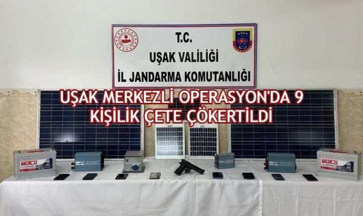 Edinilen bilgilere göre Uşak Cumhuriyet Başsavcılığı, Uşak İl Jandarma Komutanlığı ve Jandarma Genel Komutanlık Kom Daire Başkanlığı koordinesinde 6 aydır yapılan çalışmalarda Uşak merkezli İzmir, Kütahya ve Manisa illerinde de “Nitelikli hırsızlık” suçuna karışan çeteye operasyon düzenlendi. 8 ayrı adrese 100 personelin katılımıyla gerçekleştirilen operasyonlarda 8 adet cep telefonu, 8 sim kart, suç konularının yazılı olduğu 2 ajanda, 14 güneş paneli, 2 akü ve 5 invertör ele geçirilirken 9 şüpheli de gözaltına alındı.