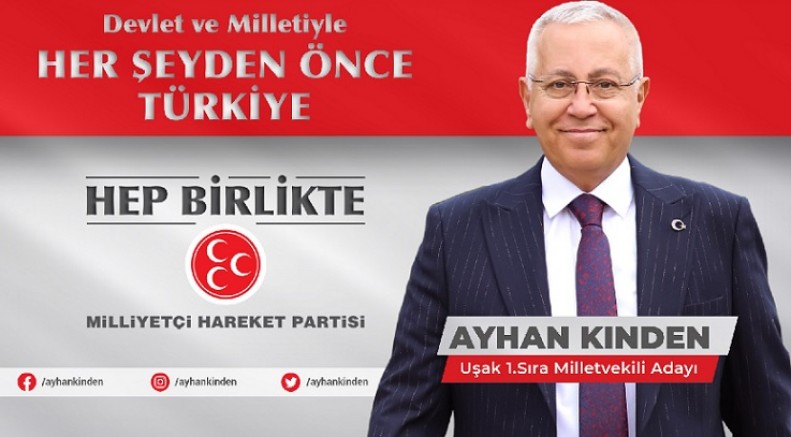Görev istenmez verilir şiarıyla Milliyetçi Hareket Partisi Genel Başkanı Dr. Devlet Bahçeli ve Parti Genel Merkezi'nin takdiriyle aday gösterildiğini ifade eden Ayhan Kınden “Teşkilatımızın bir evladı olarak önümüzdeki dönemde üç hilalimizi, milliyetçi ve ülkücü hareketimizi Türkiye Büyük Millet Meclisi’nde temsil etmek üzere içimizde yanan kutlu ateşle bizlere verilen görevi en iyi şekilde yerine getirmeye ve davamıza hizmet etmeye devam edeceğiz. Bu seçim Milliyetçi Hareket Partisi olarak, Cumhur İttifakı olarak ülkemizi içeriden ve dışarıdan kuşatan tehlikelere karşı gereken cevabı sandıkta vereceğimiz ve bozguncuların heveslerini kursağında bırakacağımız bir seçim. Gazi Mustafa Kemal Atatürk ve Başbuğumuzun izinde, bilge liderimiz Sayın Genel Başkanımızın yolunda, Cumhuriyetimizin yeni yüzyılında Uşaklı kardeşlerimle el ele vererek Uşak’ı kalkınmanın başkenti yapacağız” diyerek Uşaklılar için umudun simgesi haline geldi.