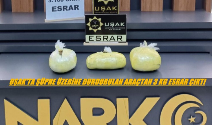 Edinilen bilgilere göre, Uşak’ta polis ekipleri şüphe üzerine bir otomobil durdurdu. Araç içerisinde yapılan aramada 3 kilo 100 gram esrar ele geçirilirken araçtaki K.H. ve G.M. ekiplerce gözaltına alındı. Şüpheli şahısların emniyetteki işlemlerinin sürdüğü öğrenildi.
