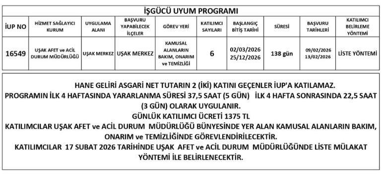 İşgücü Uyum Programı (İUP) kapsamında, Uşak Afet ve Acil Durum Müdürlüğü (AFAD) bünyesinde görevlendirilmek üzere 6 katılımcı alınacaktır.