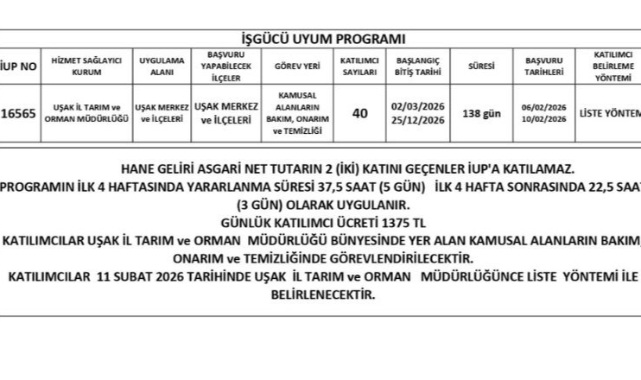 İşgücü Uyum Programı (İUP) kapsamında, Uşak İl Tarım ve Orman Müdürlüğü bünyesinde istihdam edilmek üzere 40 katılımcı alınacaktır.