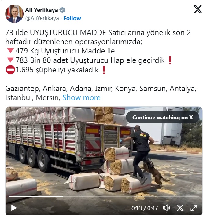 İçişleri Bakanı Ali Yerlikaya Valilerimizi, operasyonları koordine eden Cumhuriyet Başsavcılıklarımızı, EGM Narkotik Suçlarla Mücadele Başkanlığımızı ve operasyonları gerçekleştiren İl Emniyet Müdürlerimiz ile Polislerimizi tebrik ediyorum.