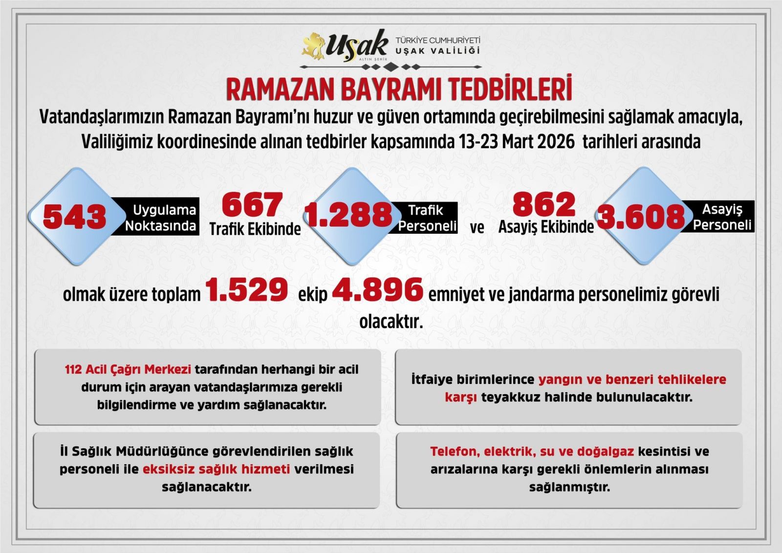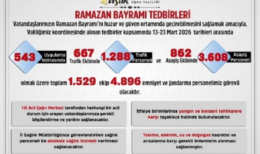 Uşak Valiliği, vatandaşların Ramazan Bayramı’nı huzur ve güven ortamında geçirebilmesi amacıyla alınan tedbirleri kamuoyuyla paylaştı. Valilik koordinasyonunda 13-23 Mart 2026 tarihleri arasında uygulanacak önlemler kapsamında geniş çaplı bir güvenlik ve hizmet planı devreye alındı.