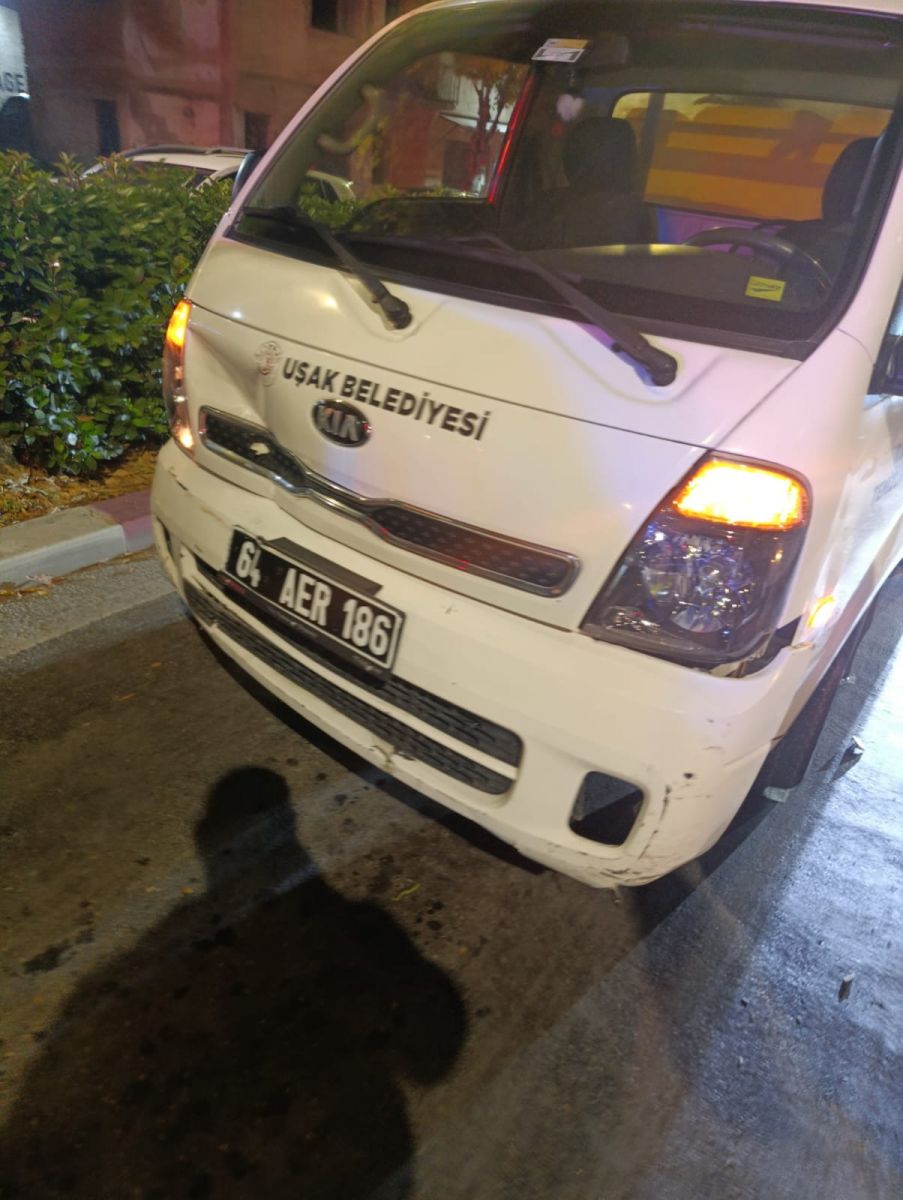 Uşak'ta bu akşam saat 21:00 civarında meydana gelen maddi hasarlı trafik kazasın'da öğretmen evi kavşağın'da ki ışıklarda bekleyen 35 KJK 15 plakalı özel otomobile 64 AER 186 plakalı belediye temizlik işlerine ait çöp kamyoneti arkadan çarptı.