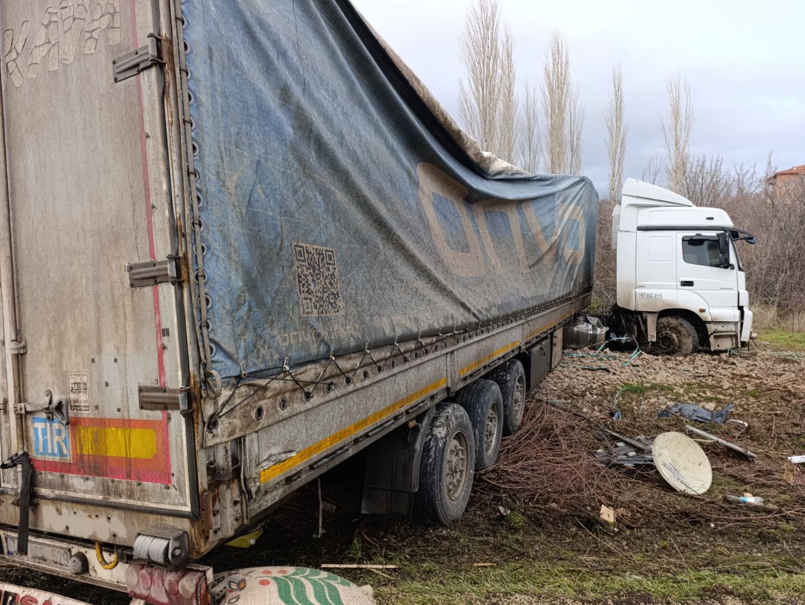 Edinilen bilgilere göre seyir halindeyken lastiği patlayan TIR, sürücüsünün direksiyon hakimiyetini kaybetmesi üzerine yol kenarındaki tarlaya savruldu.