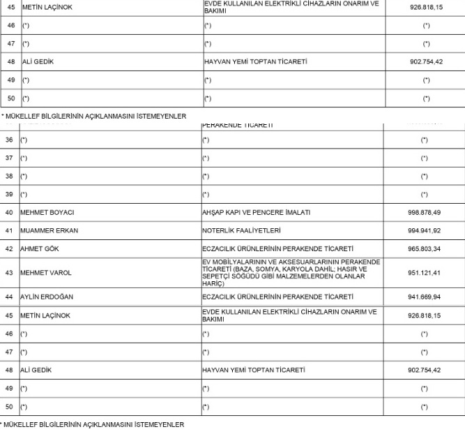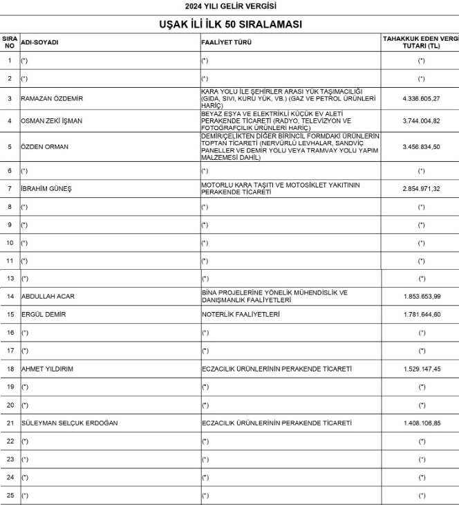213 Sayılı Vergi Usul Kanununun 5 inci maddesi ve 561 Sıra No'lu Vergi Usul Kanunu Genel Tebliği uyarınca; 2024 yılı vergilendirme dönemine ilişkin yıllık Gelir Vergisi ve Kurumlar Vergisi beyannamelerinin değerlendirilmesi sonucunda Uşak İli genelinde en fazla vergi beyan eden 50 mükellef listesi açıklandı.